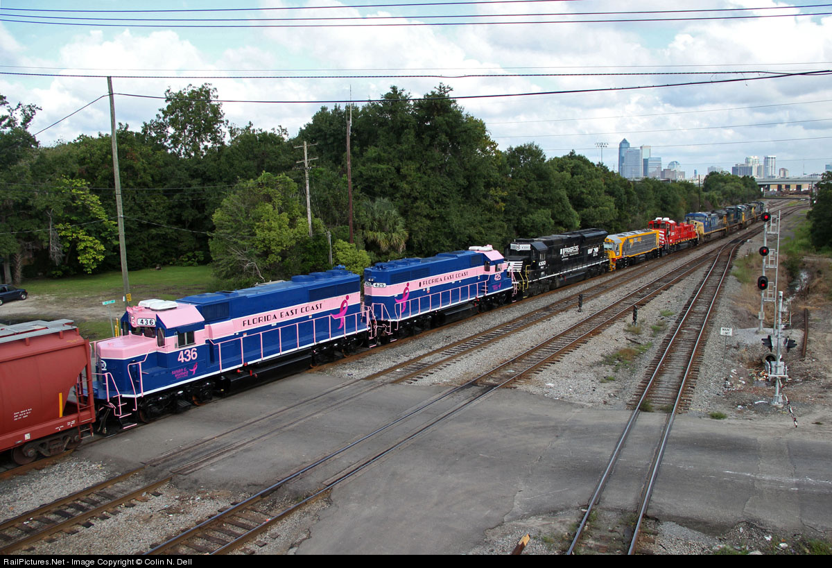 The FEC goes pink!, at least with it's new blue and pink Susan G. Comen Breast Cancer Organization paint scheme for these four axles! Today 457 carried a variety of different engines, other than the four CSX leaders, there were five more specialties. First behind the norms was PRLX 2002, a Genset locomotive. Next was PRLX2, which is transferred to Miami for shipping to Tasmania. Trailing that was PRLX 4300, an NS locomotive. Then the nice looking Florida East Coast engines that are largely displayed. Hope someone can get a shot of the PRLX2 as it is being loaded on the ship (if someone does, please send me the photo or upload to rp). View Photo ID 453544 for a photo of the locomotives before they were handed to the FEC.