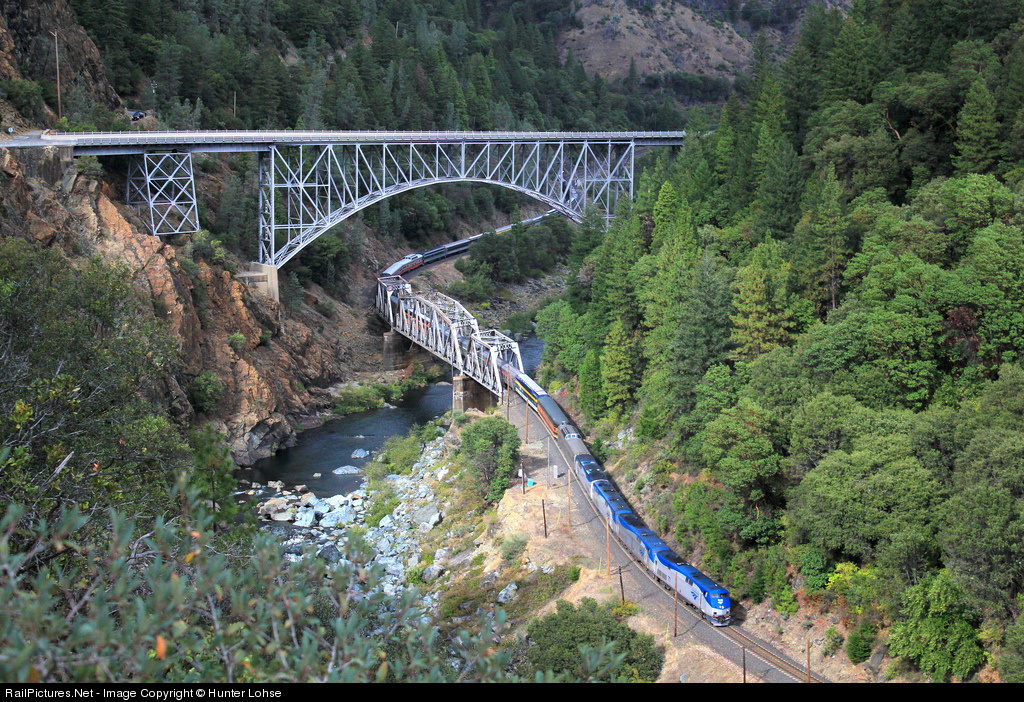 Amtrak 937 rolls through the famous double bridge scene at Pulga as it heads west down the Feather River Canyon