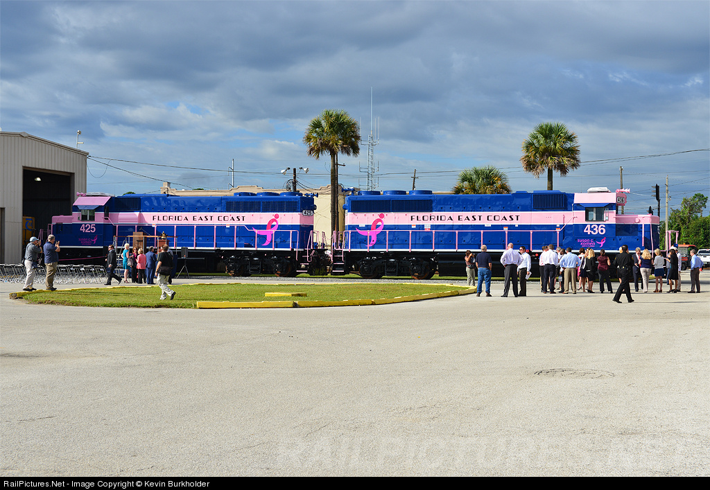 FEC GP40-3s 425 ad 436 have been given a pink stripe and highlights as well as a large pink ribbon on the end of the long hood as part of the railway's showing of support for the Susan G. Komen foundation. Units are seen at FEC's Bowden Yard following an unveiling ceremony this morning.