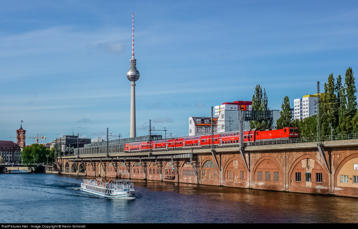 A regional train from Nauen, Brandenburg, to Berlin Schoenefeld airport is on the ride over the so-called "Stadtbahnviadukt" (rail viaduct) between the stations Alexanderplatz and Ostbahnhof at a typical Berlin sight next to the Spree river with the famous TV tower in the background.