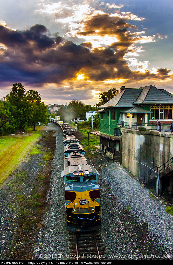| Norfolk Southern train 24Z, led by the Lackawanna Heritage Unit, passes through Phillipsburg, NJ under a dramatic evening sky. |