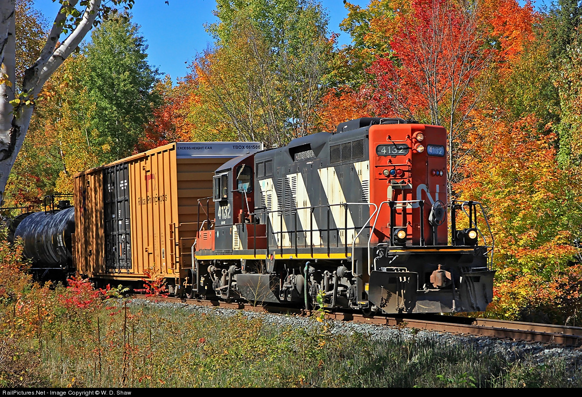 | With autumn getting into gear 595 passes some typical Muskoka fall colors at Mile 144 of the Newmarket Sub, having just finished up switching the Panolam plant at Martins on its way home from Longford Mills.