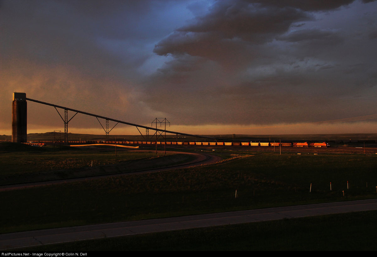 | On the evening of June 20th, dark clouds are forming as the sun sets behind the horizon, peaking through the clouds enough to create a nice lighting effect on both the coal train and clouds. |