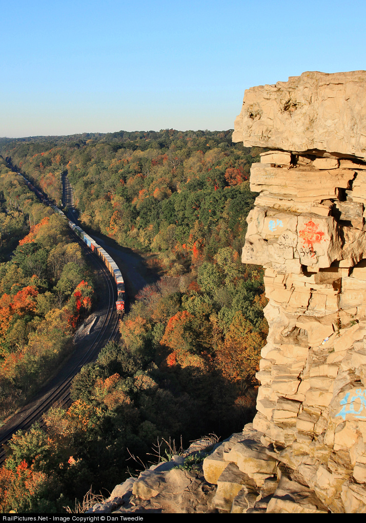 CN train 382 descends the 10 mile long escarpment grade at Dundas, Ontario.