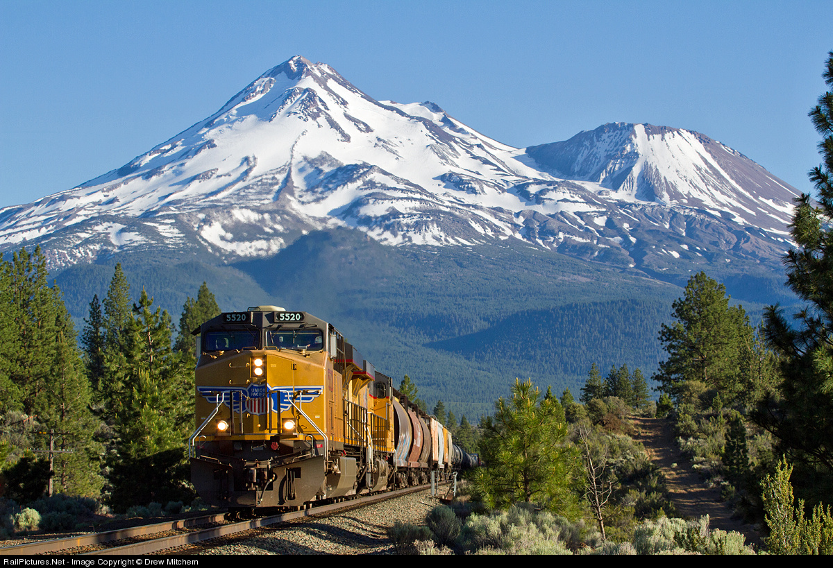 | UP 5520 leaves Mt. Shasta behind at Cougar, CA as it heads towards the summit at Grass Lake with a Roseville, CA to Eastport, ID(CP Interchange) manifest freight on 6/21/13. This time of year the sun swings just far enough to be able to get half of the nose lit on northbound trains at this location. |