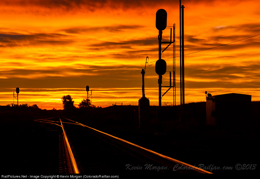 | The clouds were set up just perfect in the eastern sky to produce a fiery sunrise along the Front Range of the Colorado Rockies. Orange and red reflect from the rails at the west switch of Leyden on UP's Moffat Tunnel Subdivision. |