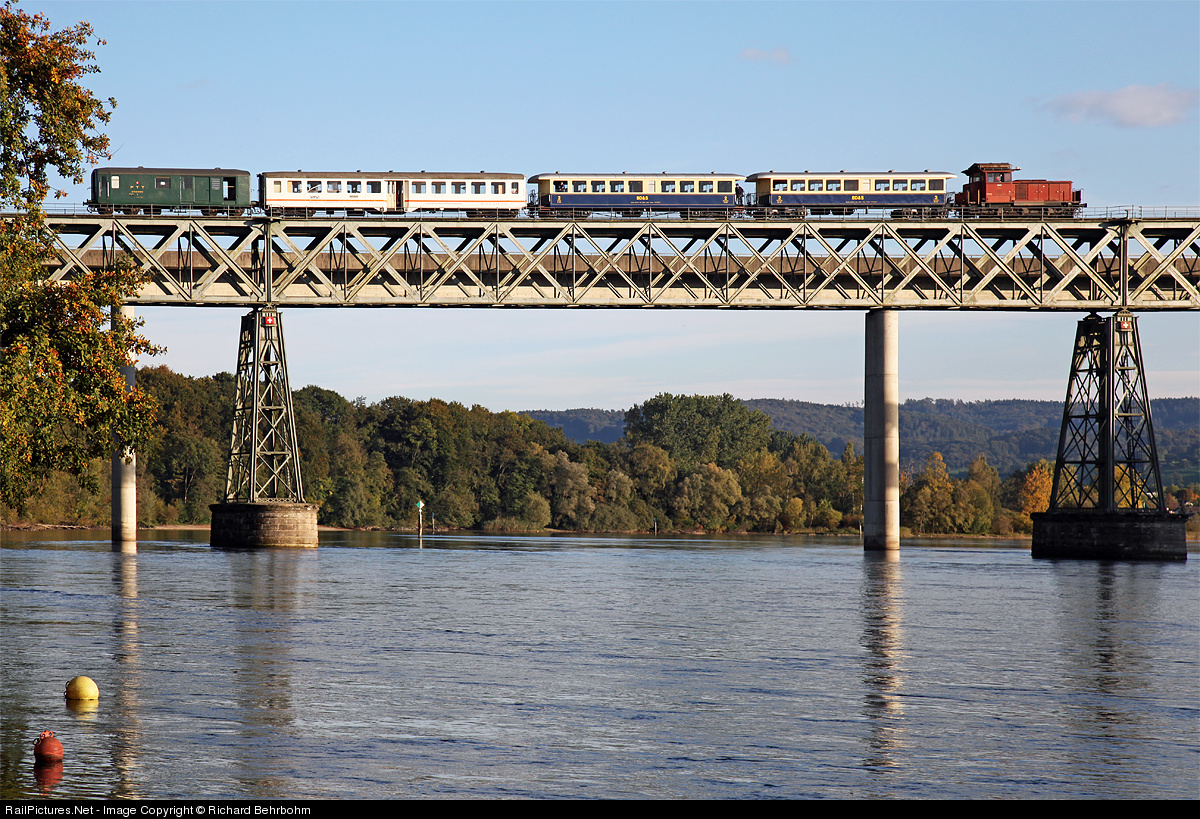 | Em 3/3 18814is pulling a train of association VES (Verein zur Erhaltung der Eisenbahnlinie Etzwilen-Singen) from Rielasingen (Germany) to Etzwilen (Switzerland). The train is crossing the Rhine bridge near Hemishofen. |