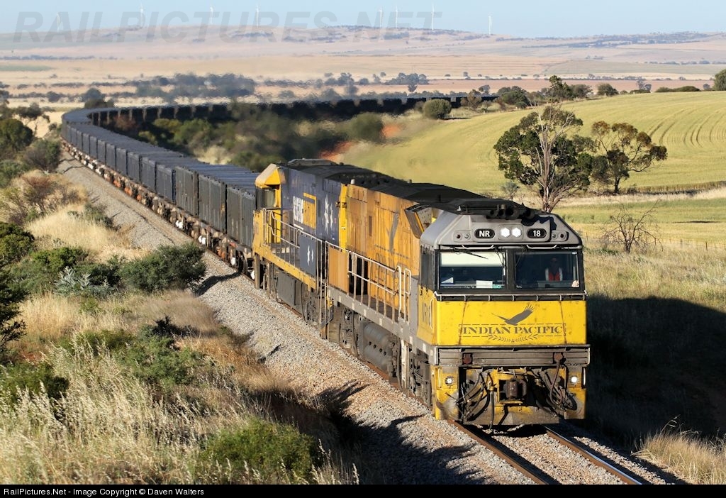 | Pacific National GE's NR18 in the new Indian Pacific livery and NR30 power empty Bemax service 1561s up the Huddlestone curves just out of Crystal Brook bound for the Bemax siding just out side of Broken Hill. |