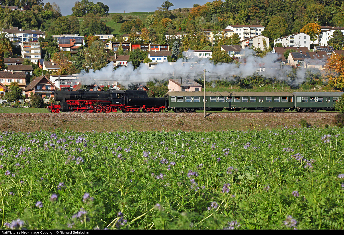 | 52 7596, a Kriegslok 2-10-0 BR 52 of association Eisenbahnfreunde Zollernbahn (EFZ), is pulling a special train from Radolfzell to Lauchringen on the occasion "150 years Waldshut - Konstanz". |