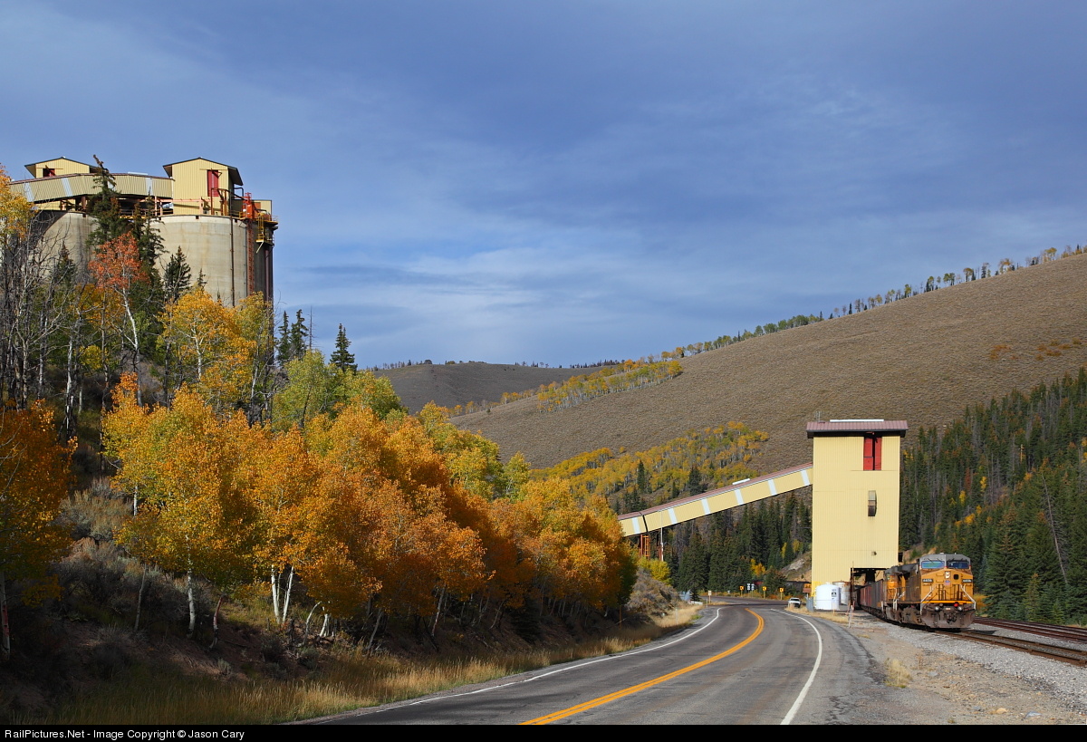 One of the first major coal fields in the Wasatch Mountains served by a railroad was here near Scoefield, UT. Over 100 years later coal still moves out these mountains in tonnage amounts that those early miners could never comprehend.... The rear DPU's shove against the train downhill, the engineer has air set as the train slowly loads under the Tipple...