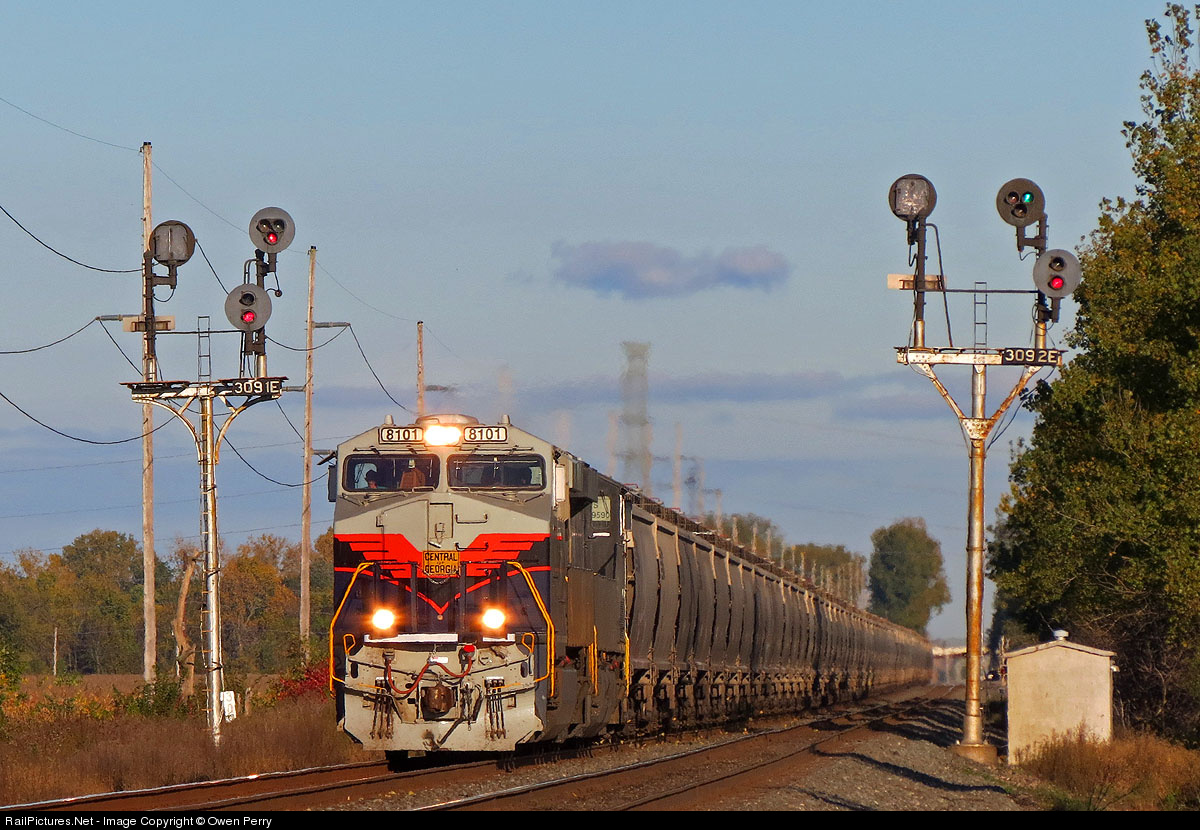 | One of the 20 heritage units, the NS 8101 Central Of Georgia, heads up a 51R grain train westbound out of Swanton, Ohio. The fall colors are starting to come out and who knows how long the masts will remain here. Why not kill three birds with one stone? Since this is my first time seeing the CoG heritage and these signals I thought I'd try my hardest to document three things at once. Last year I didn't reall get to shoot in the fall because hockey season was getting in full swing but this year I tore some muscles in my shoulder and dislocated it so it seemed like a good opportunity to go out and shoot some trains while recovering. |