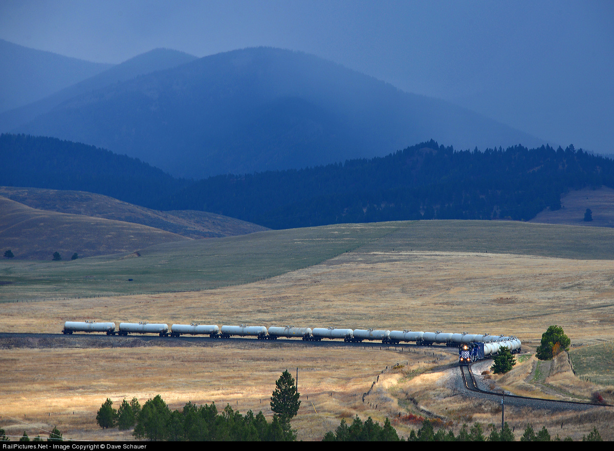 MRL's Day Gas job eases down Evaro Hill just west of Missoula as a ray of sunshine intersects with the locomotives.