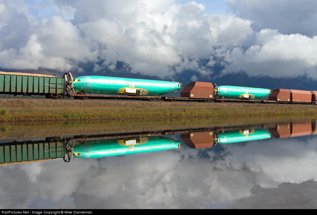 Flying through the clouds—soon enough A pair of Boeing 737 fuselages on a westbound BNSF manifest freight train passing by the reflective waters of Frog Pond west of Trout Creek, Montana, on October 2, 2013. These 737 bodies, as well as other aircraft parts, are manufactured in Wichita, Kansas, and shipped to Boeing in Seattle for final assembly. This train is operating on Montana Rail Link’s scenic Fourth Subdivision.