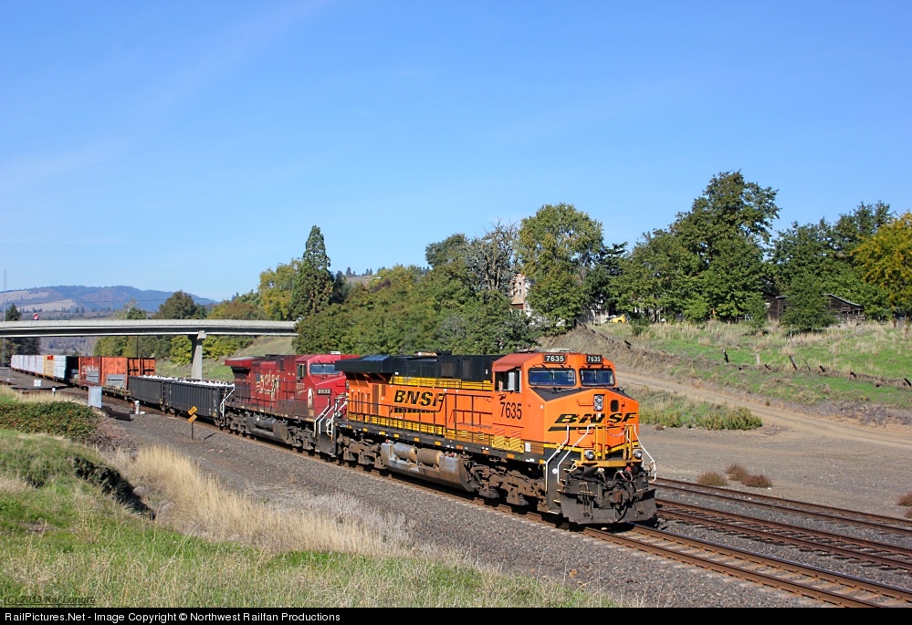 | BNSF 7635 leads a manifest through downtown Lyle, WA on BNSF's Fallbridge Subdivision in the scenic and majestic Columbia River Gorge on October 19th, 2013 around 11am local time. While waiting on a west bound loaded unit oil train, this train showed up and created a perfectly lit shot. |