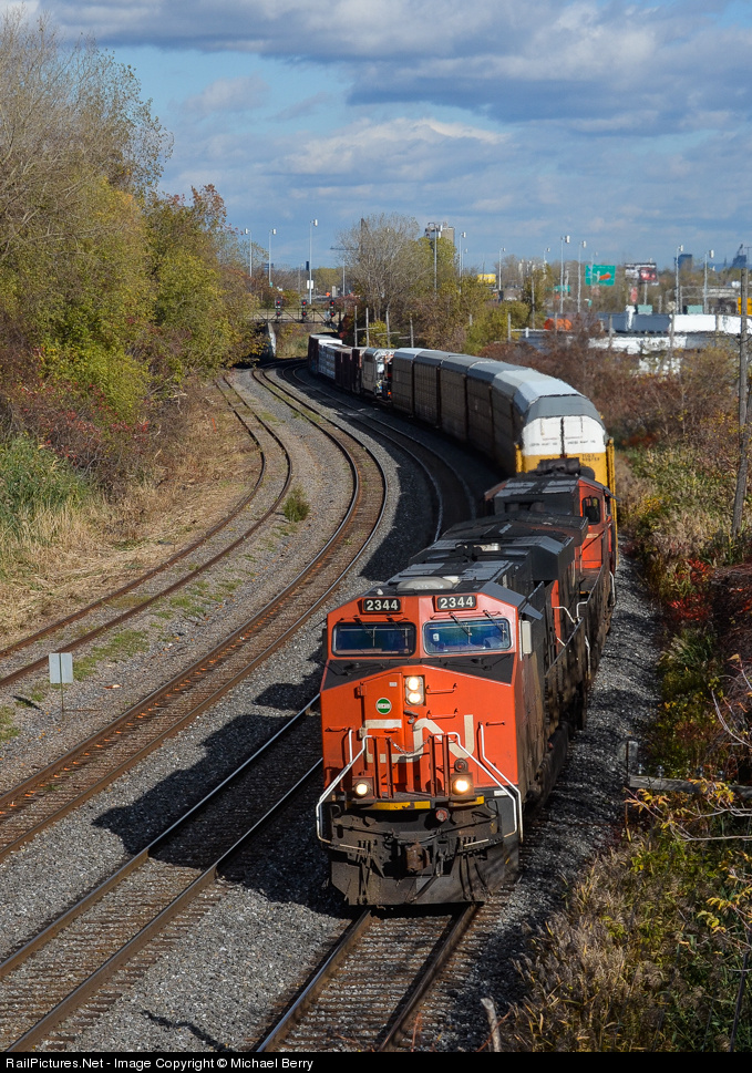 CN's last ES44DC. CN 2344, 3 years old now, is CN's last ES44DC. Here it leads CN 401 westwards through Montreal West. Trailing are CN 2570 & CN 4018. About 8 cars back is a partially finished Bombardier multilevel car for New Jersey Transit (NJT 8046). It is travelling on a flatcar and will be finished at Bombardier's plant in Plattsburgh, NY. For more train photos, check out http://www.railpictures.net/photos/mtlwestrailfan/
