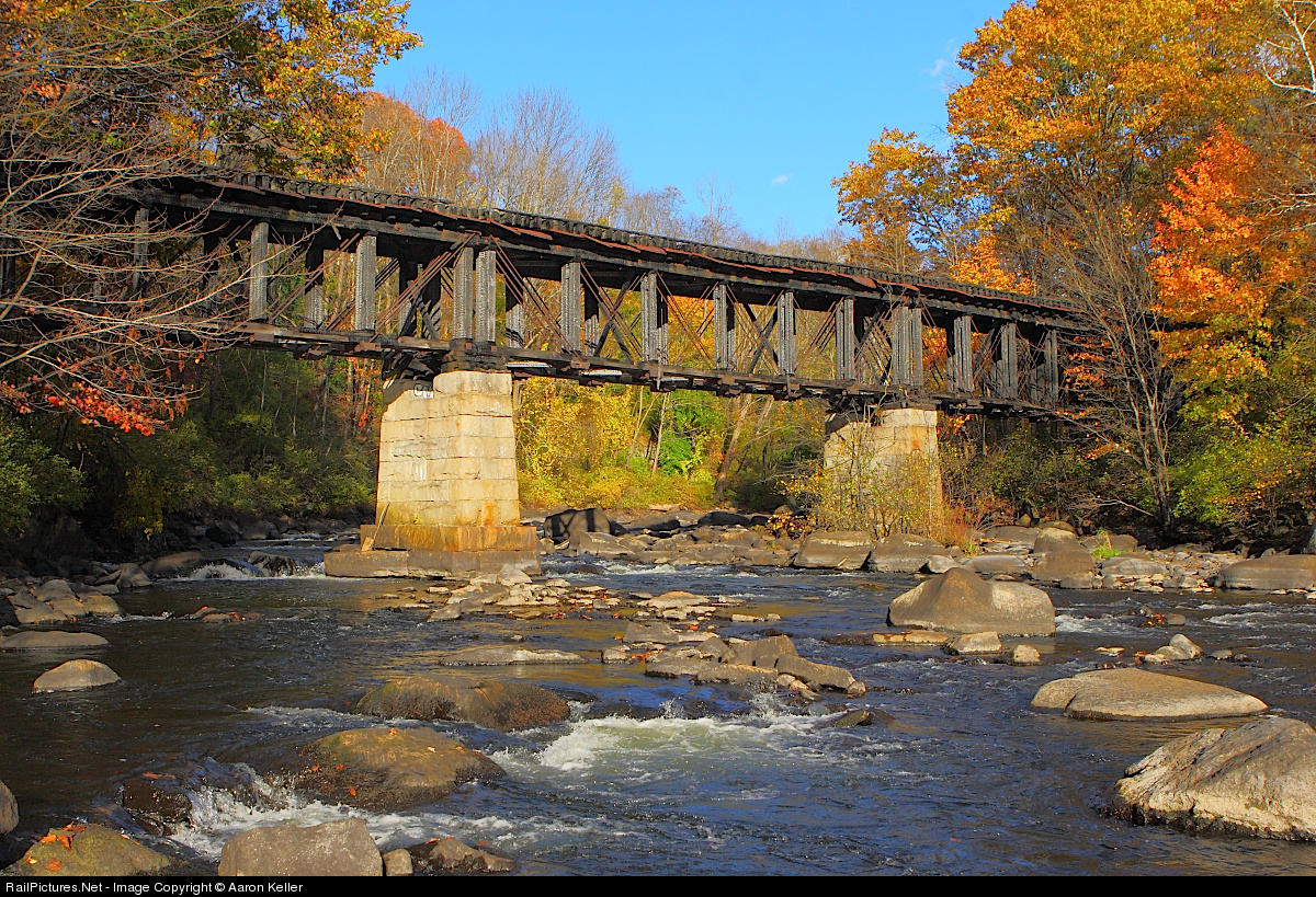 BURNED AND SCORCHED, BUT STILL STANDING. If you've been a Railpictures viewer for a while, you may recall my shot of a couple of teenagers making out on an abandoned train trestle. This is the trestle upon which those teens were sitting. I waited for a perfect autumn day to capture this view from river level below the grade. The bridge was abandoned by the Boston & Maine in 1973, and it caught fire in 1980. The entire scene still smells of charred wood, and it's a bit of a shock that the bridge is even still standing given the extent of the damage. Each of the timbers is heavily pitted and scorched. This bridge has two nicknames. It is sometimes called the "sulphite bridge" because the railroad which crossed it carried chemicals to nearby paper mills. It is also sometimes called the "upside-down covered bridge" because the structure was once completely enclosed by an exterior wooden sheath. (I personally find the latter description to be somewhat odd, because the internal trusswork is very different from that of a traditional covered bridge.) Here are two links to images of the bridge when the line was active, before the fire: link 1, link 2. The right-of-way is now a bike path, but the path detours around the site of this heavily-damaged structure. N.B. — The bridge is listed on the National Register of Historic Places. The record number is 75000130.
