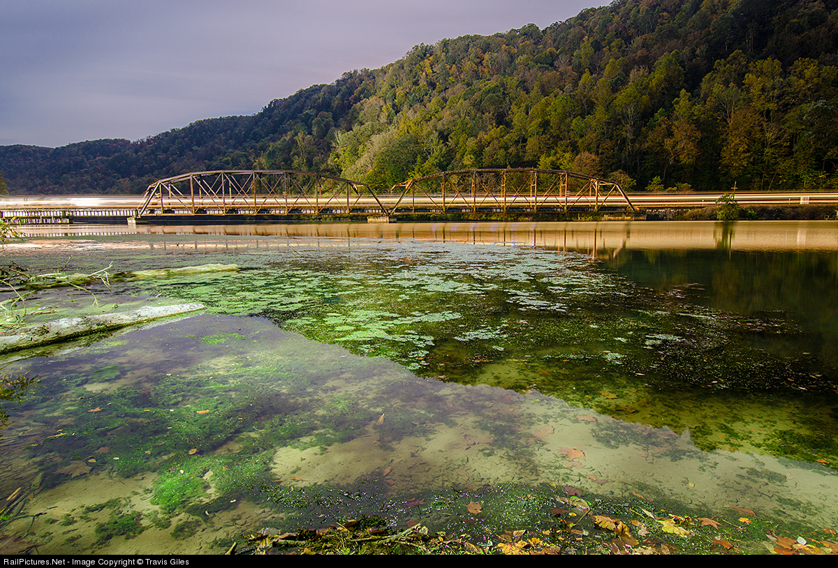 | The dead head move of the equipment for New River Train passes over the bridge at Hawks Nest, as the moon light shines through the clear water. |