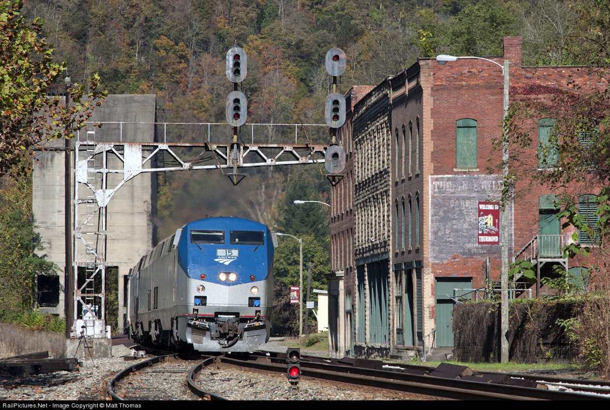The New River Train operated by The Collis P. Huntington Railroad Historical Society glides under the C&O signal in Thurmond WV and along the New River Gorge in southern West Virginia. also know as the "Grand Canyon of the East" on its way from Huntington, WV to Hinton, WV. The track to the left is the RJ Corman branch to Pax Wv.