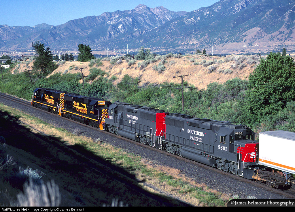 The Denver & Rio Grande Western ran a special for company photographers from Salt Lake City to the Thistle Tunnels on July 21, 1988. The mission was to obtain high quality photos to promote the D&RGW and SP prior to Rio Grande Industries acquisition of the Southern Pacific on August 8, 1988. The classy little train, with six freight cars from each carrier, rambles north through the Salt Lake Valley with two SD50s (DRGW 5514 & 5504) and two GP60s (SP 9602 & 9603) for power. It was run as a work train, symbol DRGW No. 953.