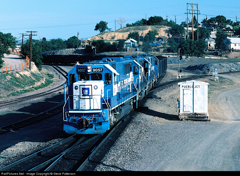Four leased Oakway SD60s lead a southbound BN coal train out of Pueblo, Colo. at Pueblo Jct. where main lines go four directions. SD60 9057 is entering the southward main track to Trinidad; the track leading straight is ATSF's main line to La Junta and on to Kansas City. The track curving to the right behind the signal cabinet is D&RGW's mainline north to Denver. The track on which the train is, coming from the yard, is also D&RGW's route to Royal Gorge. May 28, 1987.