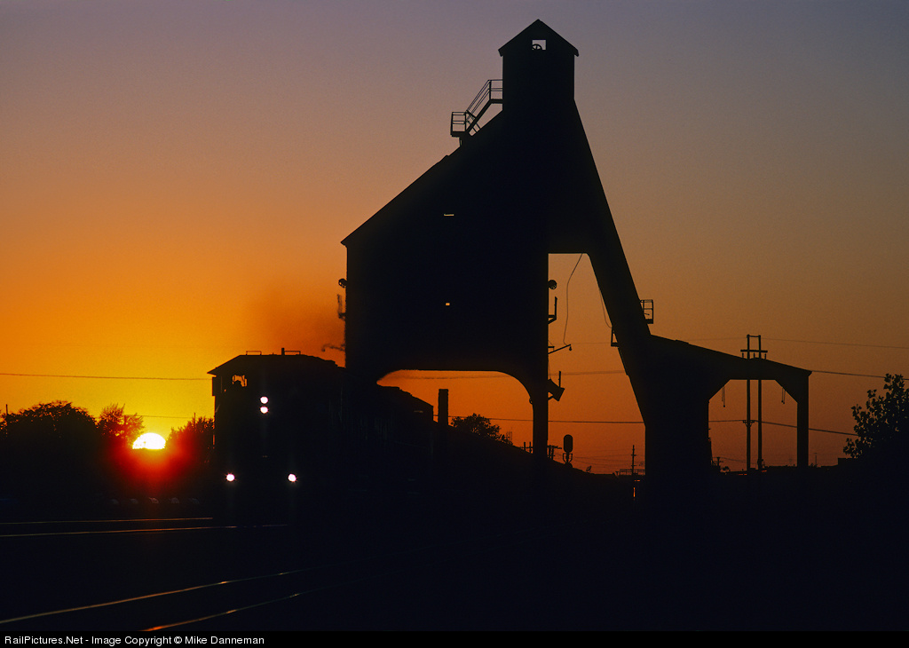 A Chicago and North Western eastbound, with a UP SD60M on the point, thunders underneath the imposing coaling tower at De Kalb, Illinois, at sunset on September 17, 1994.