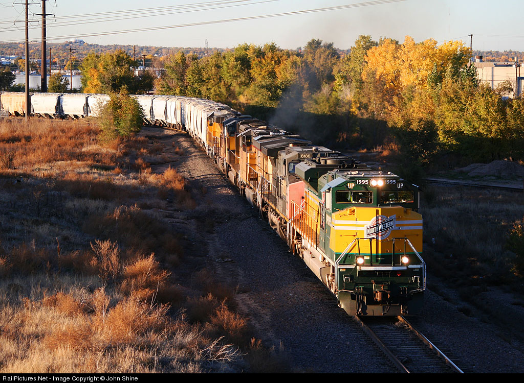 | At last light, UP 1995 painted in Chicago & North Western Heritage colors leads the Denver to N. Platte manifest approaching UP Jct. |