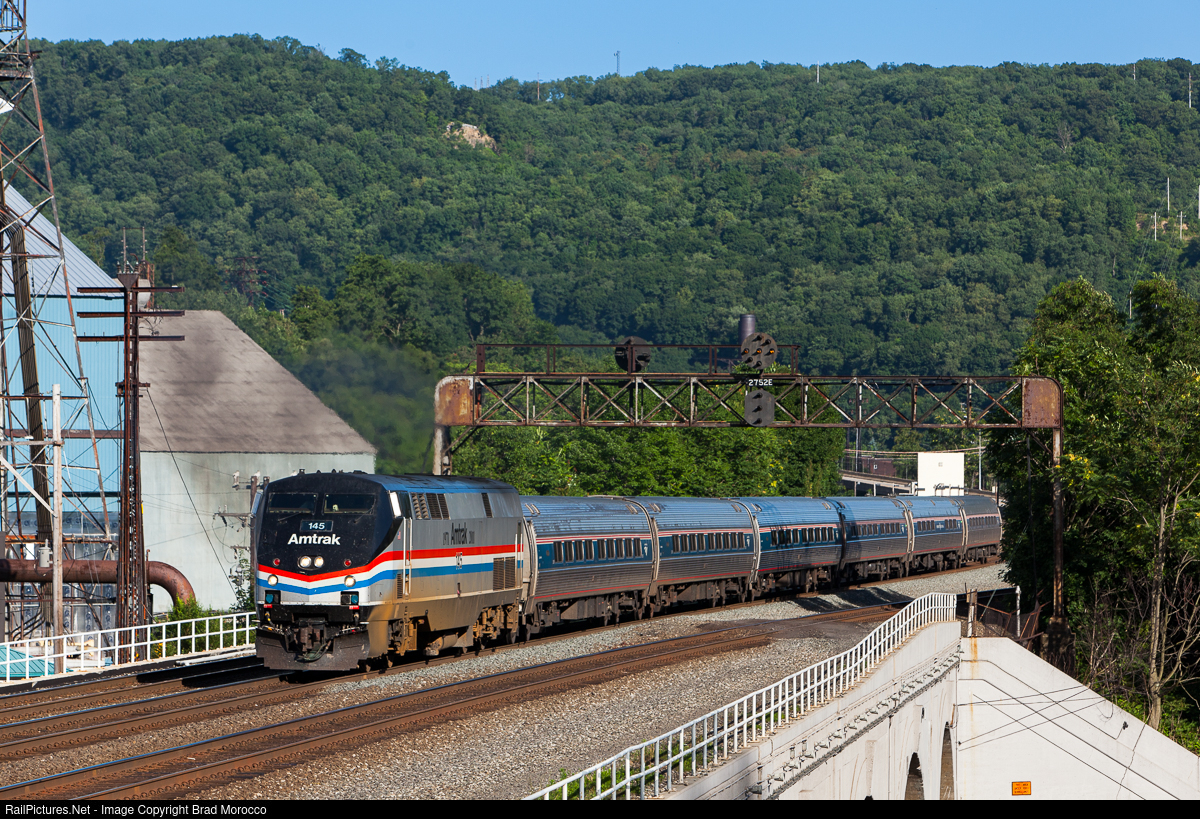 | Amtrak 145 spent much of the summer in the Pennsylvanian power pool. It is seen here after its station stop at Johnstown with the classic position light signals guiding the way. |