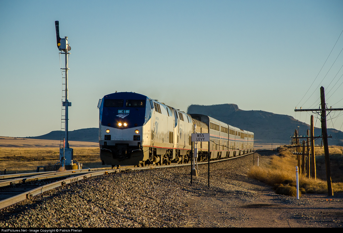 | Amtrak train #4, the eastward Southwest Chief, flies by a semaphore indicating a clear track ahead as they speed past the geologic formation that gave the town of Wagon Mound it's name. |