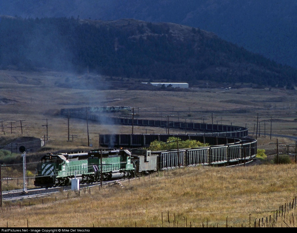 To a photographer, catching a train on a sweeping curve is fun. Catching a long train occupying an entire S-curve is more fun. Once in a great while it's possible to catch the same train running in three directions on a double S-curve -- a Ted Benson shot of sugar beets in three directions at San Luis Obispo in a WestRail calendar is indelible in my mind as perfect execution. For me, a trip to Colorado to see those sharp-looking blue-and-white Oakway SD60s on the Joint Line yielded a catch that startled this Jersey Boy visiting Denver for the first time. Among the steady parade of trains this day, a long BN coal train labored past our perch between Monument and Colorado Springs, a solid set of five Cascade green SD40s and U30-somethings pulling hard on a whole lotta coal gons. Then comes the helpers in the form of two sister SD40-2s shoving on a wide-vision caboose, flanges still whistling among the distinctive and penetrating rumble and drone of two 16-cylinder 645 prime movers hammering at about the same RPM and working equally as hard. Then I turn for the back-shot and looked in amazement at the shape the train was taking as it whistled and whined its way into the distance. Coal gons were moving in five different directions. In this era the Joint Line was jointly operated by the Burlington Northern and the Santa Fe, separate companies then. This day, it was the BN that put on an unforgettable show for an Easterner. And I'm forever grateful to Chip Sherman for being a native guide.
