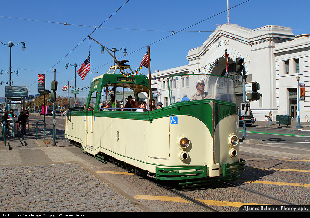 One of the biggest head turners on San Francisco MUNI's F-Market street line is car 228, the 'Boat Tram', built by English Electric for Blackpool Tramways in 1934. The motorman, wearing a skipper's cap, departs the regular stop at Pier 35 on San Francisco's Embarcadero.