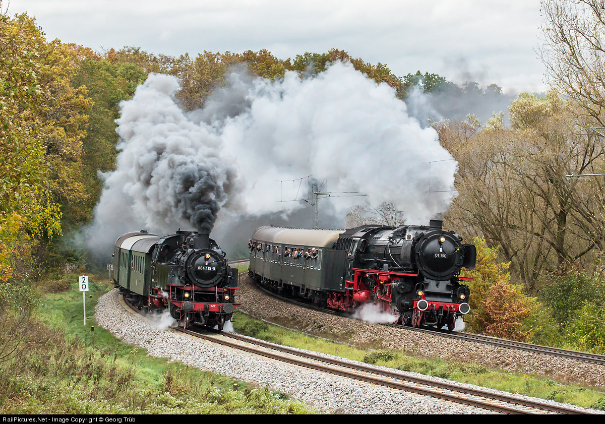 Parallel run of two steamtrains from Rottweil to Schwenningen (Neckar) and Spaichingen, two single track lines which are running parallel for about 2 km from Rottweil. On the left 2-6-2 tank locomotive 64 419 of DBK Historische Bahn, on the right famous express train steamlocomotive 01 150 (4-6-2) of DB Museum/Eisenbahnstiftung J.Schmidt, based in Heilbronn.