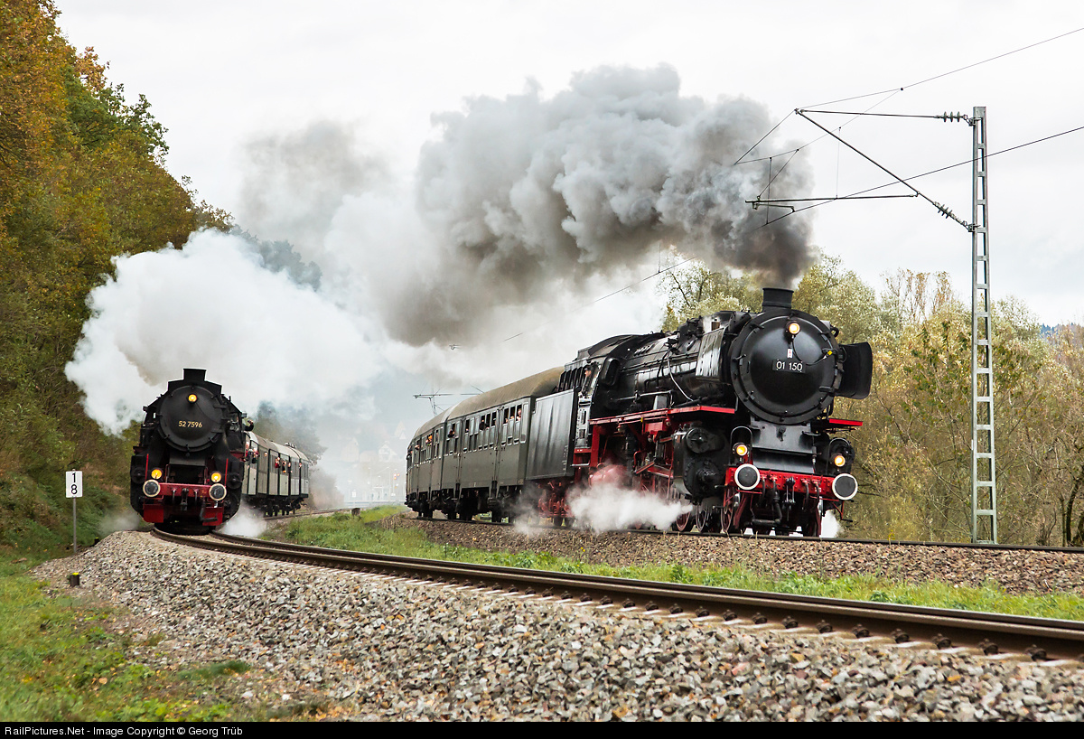 | Parallel run of 52 7596 and 01 150 with their trains for about 2 kilometers from Rottweil southbound. The 52 7596 is a 2-10-0 Deutsche Kriegslok of Eisenbahnfreunde Zollernbahn (EFZ), tze 01 150 a 4-6-0 "Pacific" express train steamlocomotive of DB Museum/Eisenbahnstiftung J.Schmitt, based in Heilbronn. |