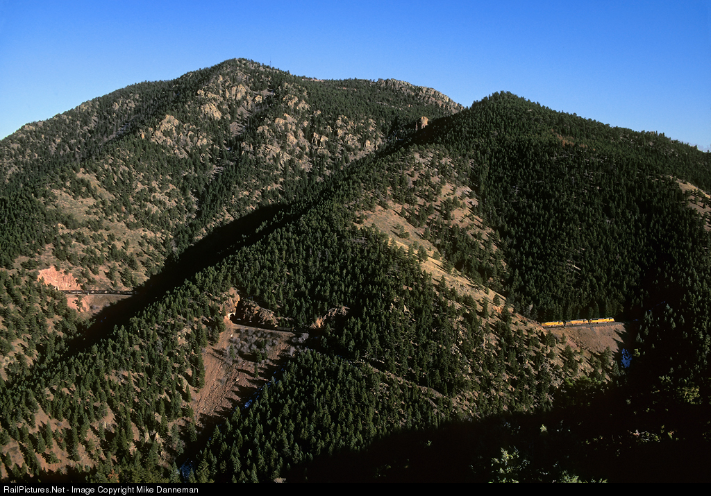 Threading the Tunnel District A westbound Union Pacific coal empty threads the tunnel east of Crescent, Colorado, on October 26, 1999. In this view the train is exiting Tunnel 12, and curving through Tunnels 13 and 14, while lead locomotive EMD SD9043MAC No. 8284 is about to enter Tunnel 15.
