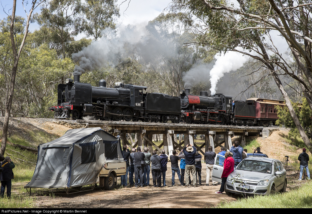 K190 and J515 cross the wooden trestle near Sawmill Road between Castlemaine and Muckleford, with the first steam-hauled through train from Melbourne to Maldon since 1976. This was part of the Maldon Steam spectacular, a joint effort between Steamrail Victoria and the Victorian Goldfields Railway involving 5 different steam locomotives. I was lucky enough to get a cab ride over this section on the return journey, the footage of which can be seen here: http://www.youtube.com/watch?v=wCNl5wZ9CiA