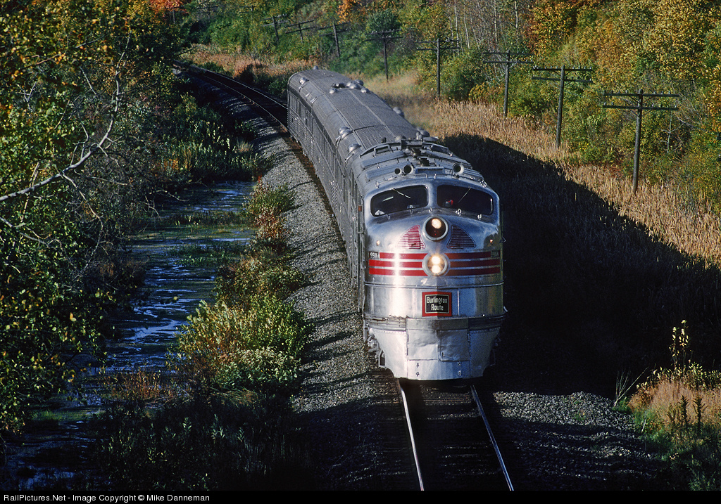 Looking like a Zephyr of old dashing through the midwestern countryside, the Illinois Railway Museum’s Chicago, Burlington and Quincy EMD E5 No. 9911-A leads the Nebraska Zephyr trainset during an early and somewhat rare excursion off museum property. The train operated from Burlington (Wisconsin) to Neenah and return on Wisconsin Central. Late in the afternoon of September 30, 1993, the Zephyr cruises into Slinger, Wisconsin, as seen from the Arthur Road overpass north of town.