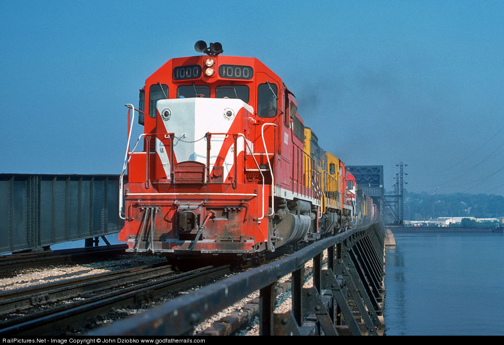 TPW GP40 1000 leads an eastbound freight over Santa Fe's Mississippi River bridge from Fort Madison, IA into Niota, IL and will regain TPW rails at Lomax, several miles east. This bridge is unique as the highway shares the same spans, albiet on the top level.