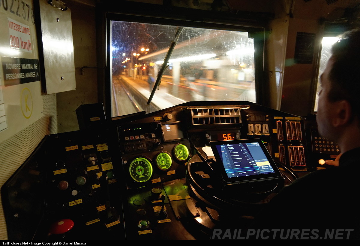 | Cab view in BB 22378 French locomotive of a 930 tonnes infrastructures freight train. You can see the new SNCF drivers tool system (an IPAD) named Sirius where the travel is detailled with speed limit, name of crossed stations, warning bulletin, delayed time and all other technical documents...