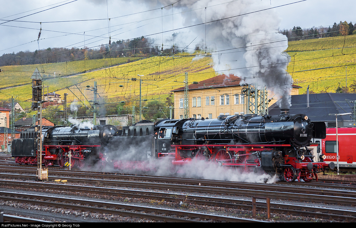 The two former Deutsche Bundesbahn "Pacific" express train steamlocomotives 01 202 and 01 150 are preparing to take over a 8 car train from Würzburg to Neuenmarkt-Wirsberg, with the yellow leafs in the vineyard of the Main valley in the background. 01 202 left Meiningen works the day before after a nearly two years overhaul, mainly concerning the boiler from 1935! The 01 150, which played a main role in 1935 during the 100 year anniversary of the railway in Germany, was in the parade in Nürnberg-Langwasser in september 1985 for 150 years railway in Germany, but suffered severe damage during the fire in the engine shed in Nürnberg 2005. Now it is operational again since may 2013.
