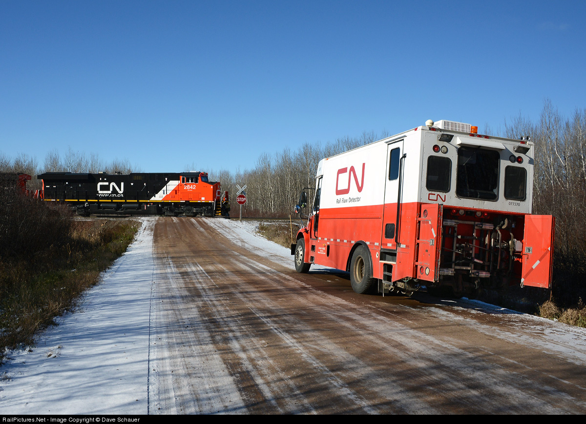 A near-spotless 2842 rolls north past Nopeming Junction while a CN inspection truck waits for the train to clear.