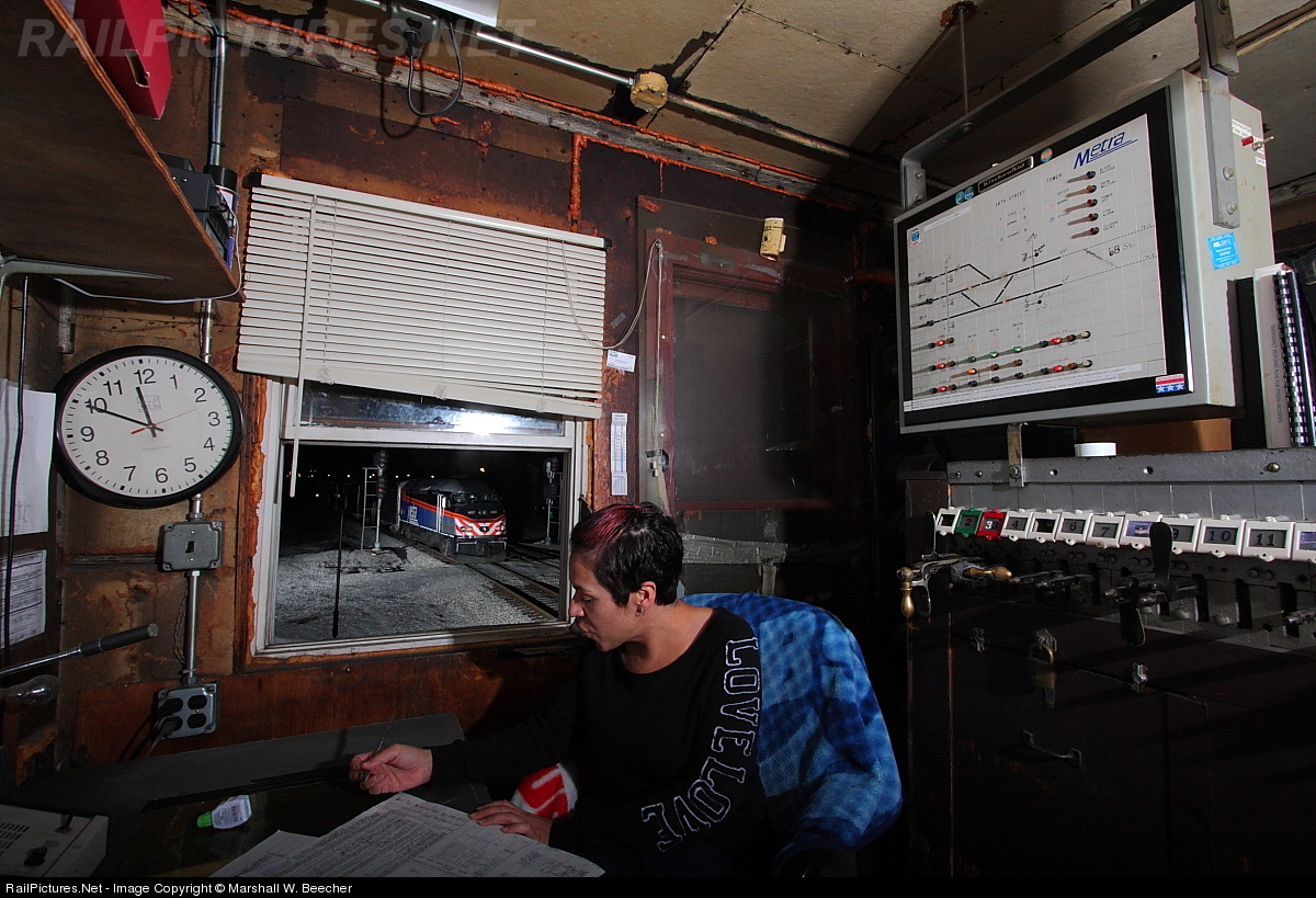 Just shy of the midnight hour, 16th Street Relief operator Madelyn Gonzalez jots down the passage of Metra Rock Island District's last train into LaSalle Street for the night, as its' MP36 locomotive fades into the surrounding urban darkness. Metra's "operating museum" at 16th Street has it all - from more contemporary push-button N/X interlocking controls on the top box, to the older GRS "Model 2" pistol grips that date back to the early years of the 1900's, this place has a lot of character and amazingly still reliably serves the traveling public 24/7/365 by the men and women of Metra's Rock Island District.