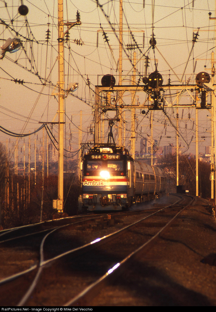 The September sunsets in New Jersey can be spectacular. By the middle of the 1980s I got to be friends with many railroaders. An especially influential friend of that era was Steve Turkenkopf, an Amtrak operator. On this day he was working second trick Portal, which controlled the crossovers on either side of Portal Draw. It was also the last tower eastbound trains would pass before entering the North River Tunnels to reach PennStation, so part of the operator's job on eastbound trains was to count the number of cars to relay that information to A Tower, so the operator there knew where to place that train in the station. That's right, the famous Solari Board wouldn't start clicking its panels to display a track number to the hundreds of passengers gathered under the Solari Board until Portal gave A Tower the time and car count. Turkenkopf allowed me to pass train information between towers each time I visited him. To me, that was as much fun as any cab ride or throttle time, taking part in railroading's big picture and continuing a more-than-century-old tradition. Amtrak's towers on the Northeast Corridor were the last string of towers that operated so traditionally in America, and I got to spend time in most of them. On this day, while "posting" with Steve the sunset was irresistible so I stood outside the tower to take a few pictures in the golden light. The most unusual thing about Portal tower is that it was at ground level, built into the side of the fill on the east-side approach, so the operator was actually looking up at the passing trains. The only access to the tower required the operator to walk across Portal Draw. I always felt that any train could pick the mitre rail and destroy that tower, and one day in the 1990s a train did, not long after the tower closed for good. In this scene Amtrak AEM-7 944 is leading a basic Metroliner consists westbound toward Portal Draw. Next stop, Newark PennStation.