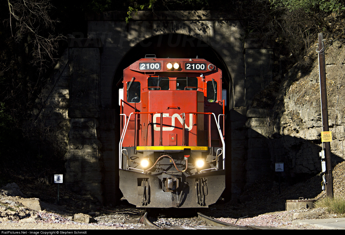 CN 2100 pops out of the 90-degree curved tunnel at East Dubuque, Illinois with a loaded grain train. Half of the train is in a tunnel, half on a bridge, half in Illinois, and half in Iowa! (Also, check out the IC logo beneath the anti-climber)