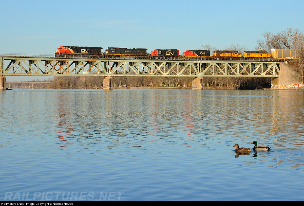 Under the regards of ducks, the CN 401 pass over Richelieu river in the Sunset, with ex-Wabush Lake railway (908 & 909) unit. These 2 old RS18, is bound for Saskatchewan.