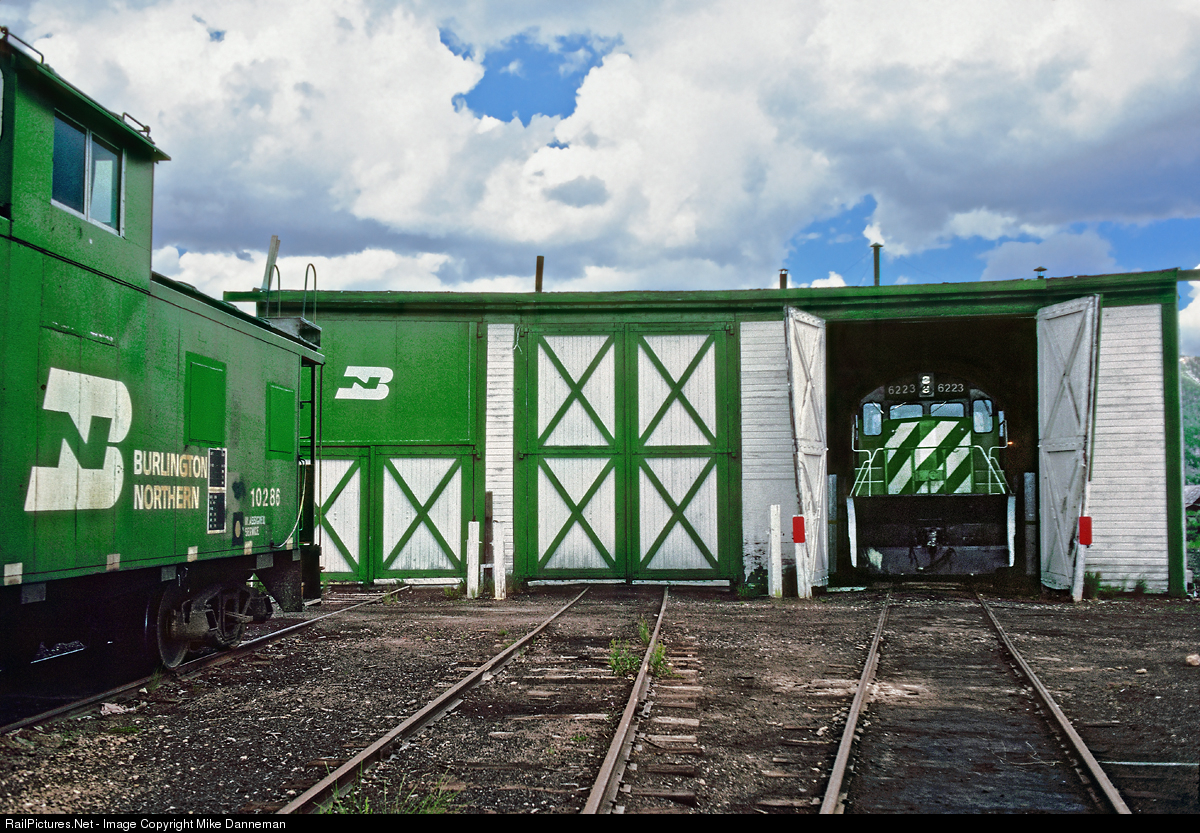 Just after putting a two-car train away in the yard and spotting caboose No. 10286, the crew of SD9 No. 6223 have put the locomotive to rest inside the spiffy looking wooden roundhouse at Leadville, Colorado, on a summer day in July 1984. The train just made a trip to the molybdenum mine at Climax, at an elevation of 11,400 feet, making this run the highest standard gauge rail operation in the U.S. at the time. Burlington Northern predecessor Colorado and Southern had an extensive narrow gauge network in the mountains of Colorado, but by 1941, only the 14-mile branch from Leadville to Climax remained.