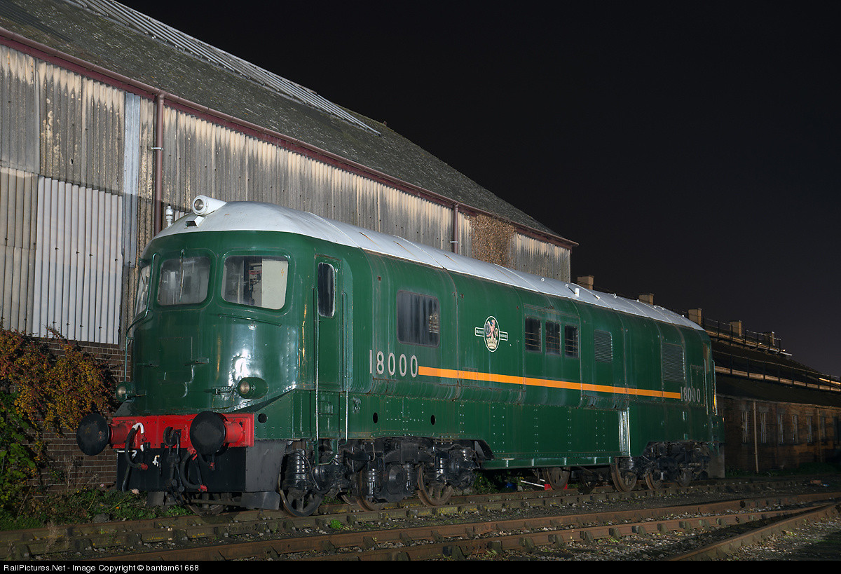 | Prototype gas turbine electric loco 18000 built by Brown Boveri in 1949 stands at Great Western Society depot at Didcot during an evening photoshoot |