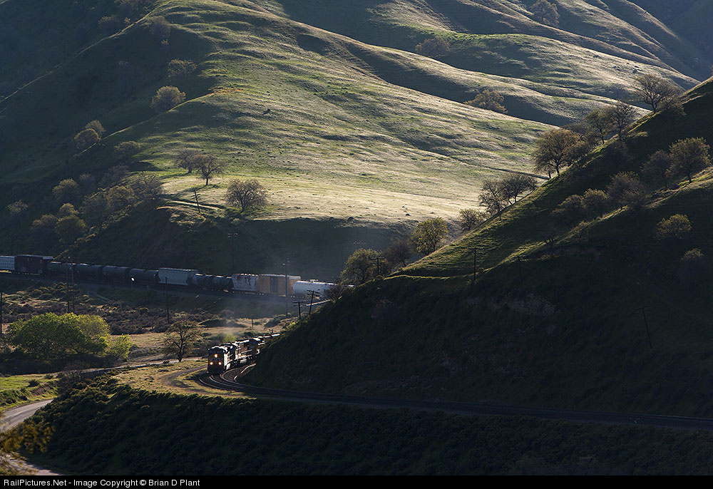 A Union Pacific drag climbs upgrade between Caliente and Bealville in the Tehachapi Mountains as the morning sun begins to cast light on the rolling green hills.
