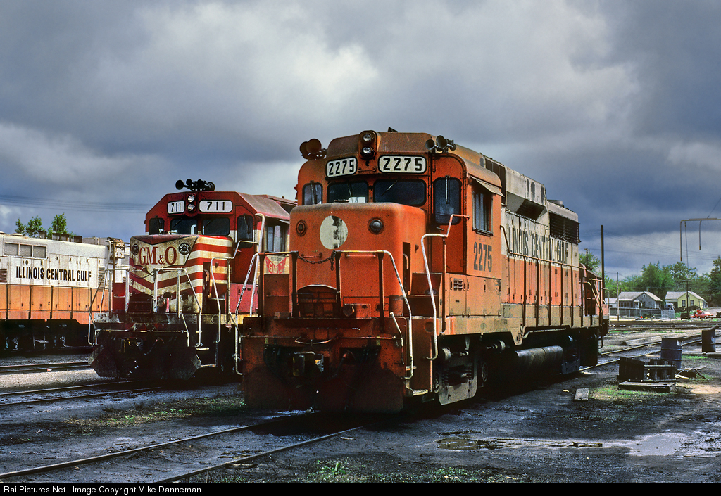 Illinois Central Gulf GP30 No. 2275 rests at ICG’s Bloomington, Illinois, engine facility in May 1984. The locomotive is a former Gulf, Mobile and Ohio unit (equipped with Alco trucks from a trade in), while one track over, GP38 No. 711 still carries GM&O colors.