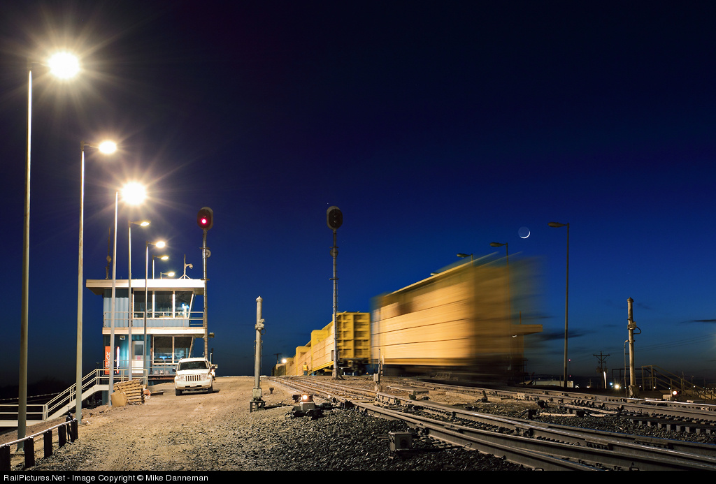 Humping under a Waxing Crescent A setting waxing crescent moon shows up in the still blue western sky as centerbeams loaded with lumber get classified on the East Hump at North Platte, Nebraska, on the evening of May 4, 2011. The huge Union Pacific yard hums along 24 hours a day, seven days a week, as tonnage moves across the UP system.