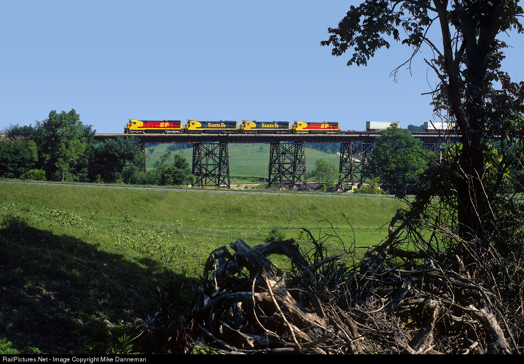 Four elephant-style GE C30-7s pull a Santa Fe piggyback westbound over Media Trestle east of Media, Illinois, on the warm spring day of May 31, 1986. The lead and trailing locomotives are brightly painted for the ill-fated Southern Pacific-Santa Fe merger.