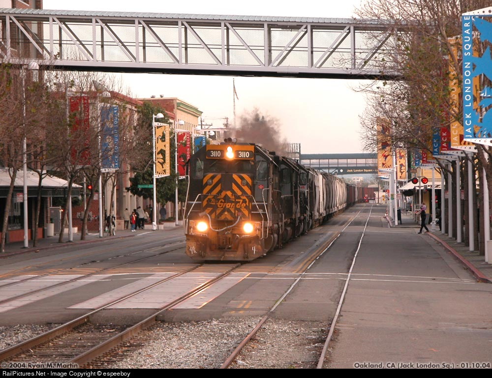 | Grande style street running! From their reactions, I believe a few non-railfan pedestrians actually noted that this lash-up was a bit different from the boring all-yeller normal freight train! |